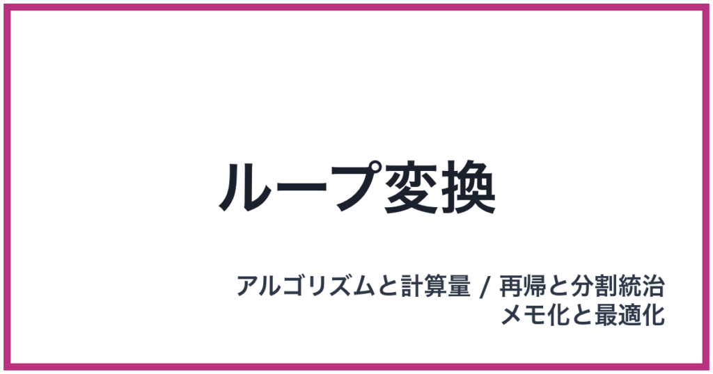 ループ変換 英語表記: Loop Conversion 概要 ループ変換は、再帰的な構造を持つアルゴリズムを、反復処理(ループ)を用いた形式に書き換える最適化技術です。これは、アルゴリズムを「再帰と分割統治」で定義した後、実行時の効率を大幅に向上させる「メ... -