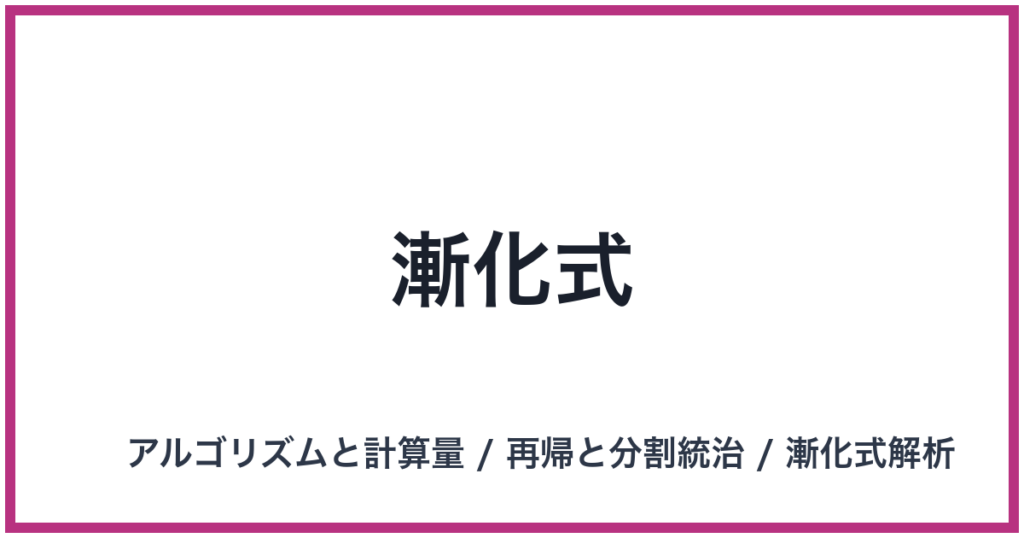 漸化式 英語表記: Recurrence Relation 概要 漸化式(ぜんかしき)とは、アルゴリズムと計算量という文脈において、特に再帰と分割統治の技法を用いたアルゴリズムの実行時間や計算量を表現するために用いられる数式のことです。これは、ある入力サイズ $n... -