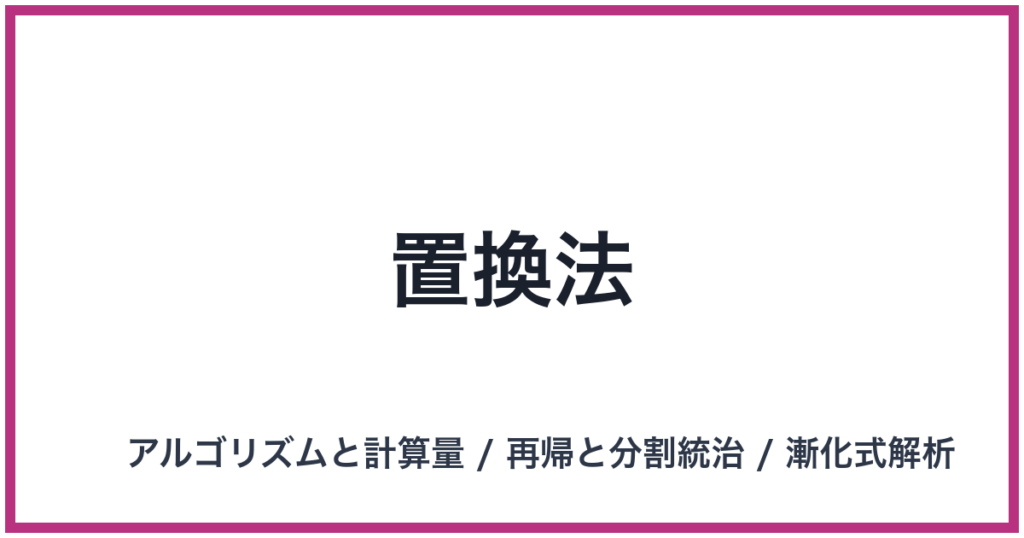 置換法 英語表記: Substitution Method 概要 置換法(Substitution Method)は、「アルゴリズムと計算量」の分野、特に「再帰と分割統治」によって定義されるアルゴリズムの効率(計算量)を解析する際に用いられる、漸化式を解くための強力な手法です。こ... -
