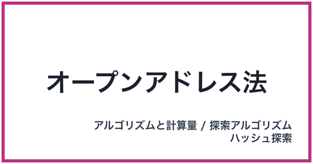 オープンアドレス法 英語表記: Open Addressing 概要 オープンアドレス法は、アルゴリズムと計算量 → 探索アルゴリズム → ハッシュ探索という流れの中で、データ格納時に発生する「衝突(コリジョン)」を解決するための重要な手法の一つです。ハッシュ関...