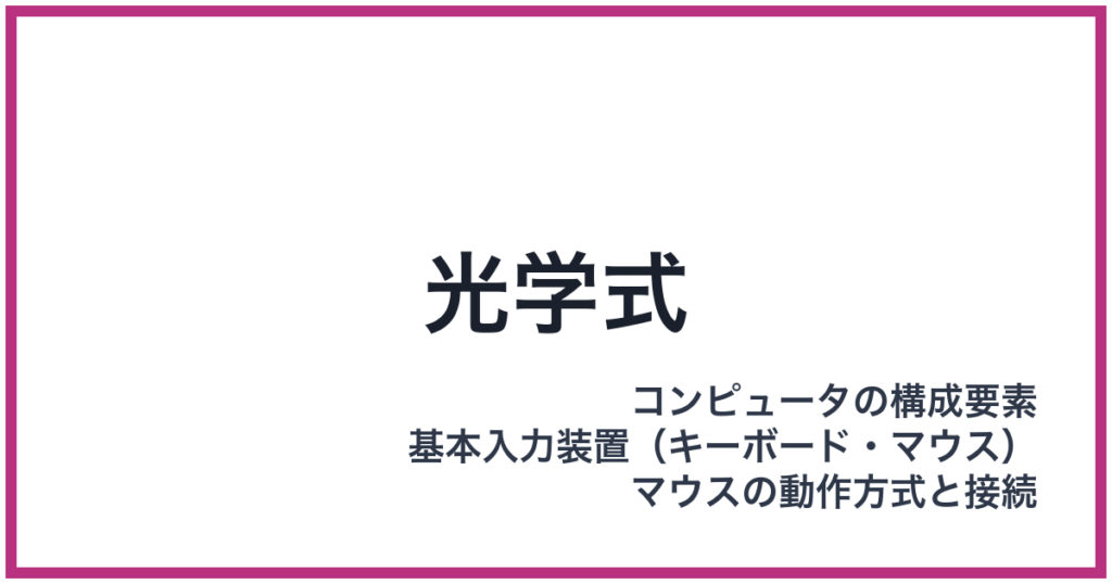 光学式(BlueLED: ブルーエルイーディー) 英語表記: Optical 概要 光学式とは、コンピュータの基本入力装置であるマウスが、その移動方向と距離を検出するために光(LEDやレーザー)を利用する動作方式のことです。これは、かつて主流であった機械式のボ... -