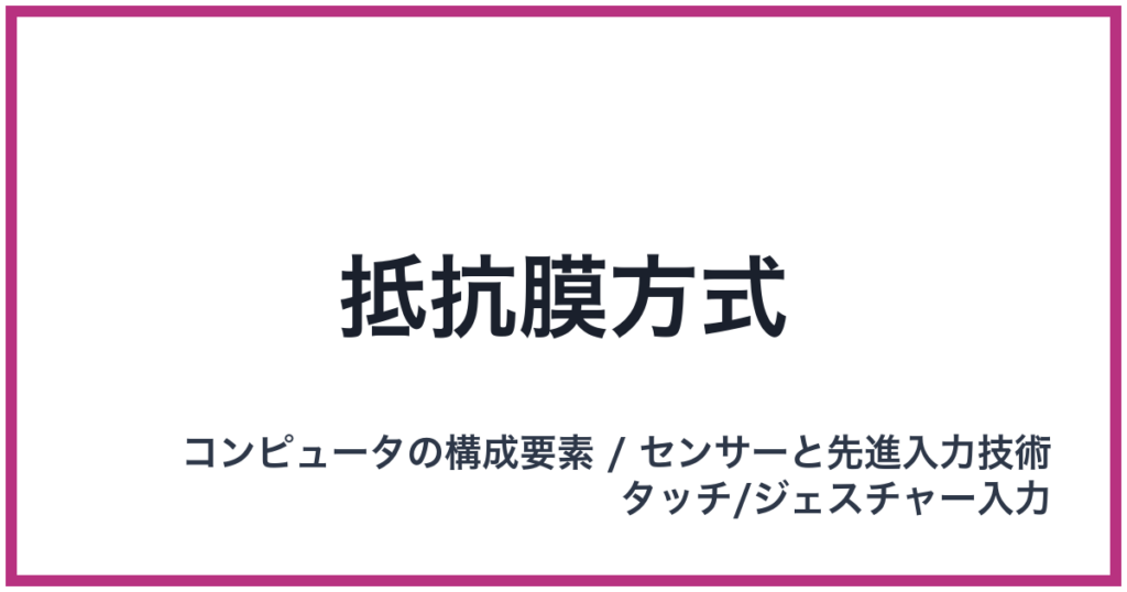 抵抗膜方式 英語表記: Resistive Touch Screen 概要 抵抗膜方式(Resistive Touch Screen)は、私たちが日常的に触れるデジタルデバイスにおいて、指やペンによる接触を感知し、座標を入力する技術の一つです。これは、コンピュータの構成要素の中でも特に... -