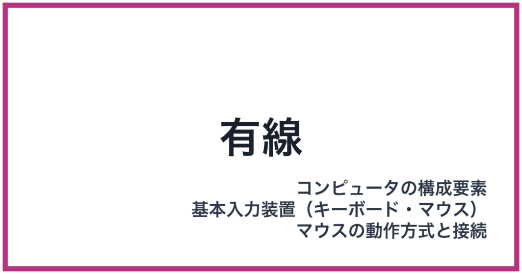 有線(GHz: ギガヘルツ) 英語表記: Wired 概要 「有線」とは、コンピュータを構成する「基本入力装置」(ここではマウス)と、本体との間でデータ通信や電力供給を行う際に、物理的なケーブルを用いる接続方式のことを指します。特に「マウスの動作方式と... -