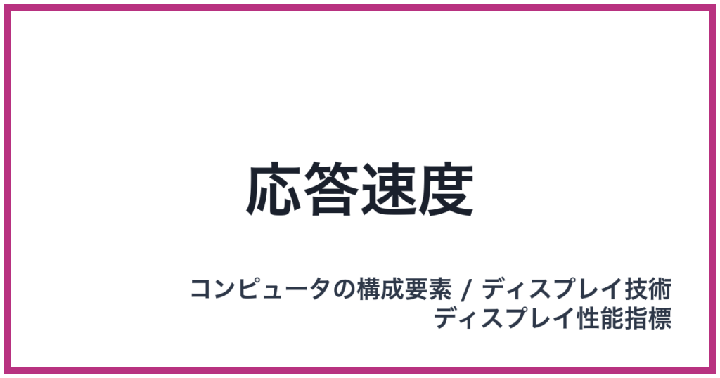 ``` 応答速度 英語表記: Response Time 概要 応答速度は、コンピュータの構成要素であるディスプレイが、画面上の特定の色から別の特定の色へ変化するまでにかかる時間を示す性能指標です。これは主にミリ秒(ms)単位で表され、数値が小さければ小さいほ... -